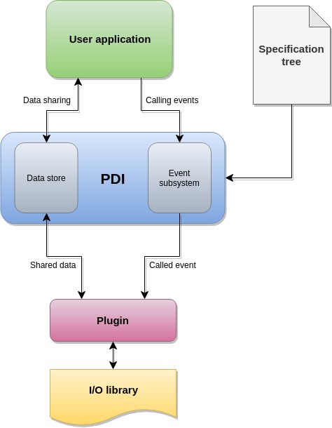To summarize, interactions between weakly coupled modules in PDI go through the data store that acts somewhat like a file-system. One can share data buffers in this store to make them available to other modules. When a buffer becomes available in the store, the event subsystem notifies interested modules so that they can use the data. The plugins loaded and configured through the specification tree offer various reusable services through that mechanism such as data write to disk, fault tolerance, code coupling, etc.