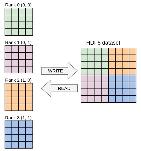 Running the code from the previous exercises in parallel should already work and yield one file per process containing the local data block. In this exercise you will write one single file with parallel HDF5 whose content should be independent from the number of processes used. Once again, you only need to modify the YAML file in this exercise, no need to touch the C file.