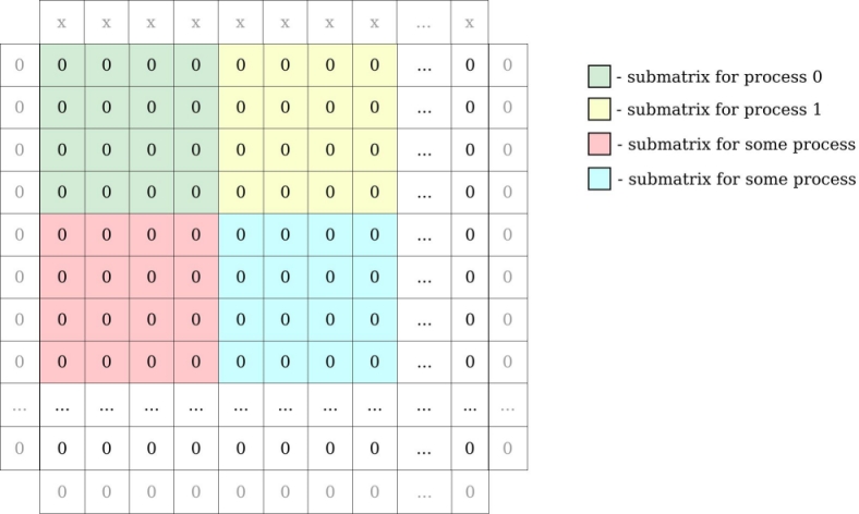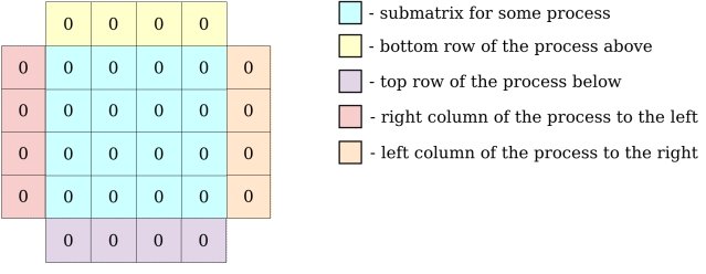 For example: matrix 16 x 16 integers and 16 MPI processes gives submatrices of 4 x 4 integers for every process. We have to add to our global matrix one row above and below, column to the left and right to be able to compute border cells. In our example row on the top has some value (”x”) bigger than 0 (representing source of heat):